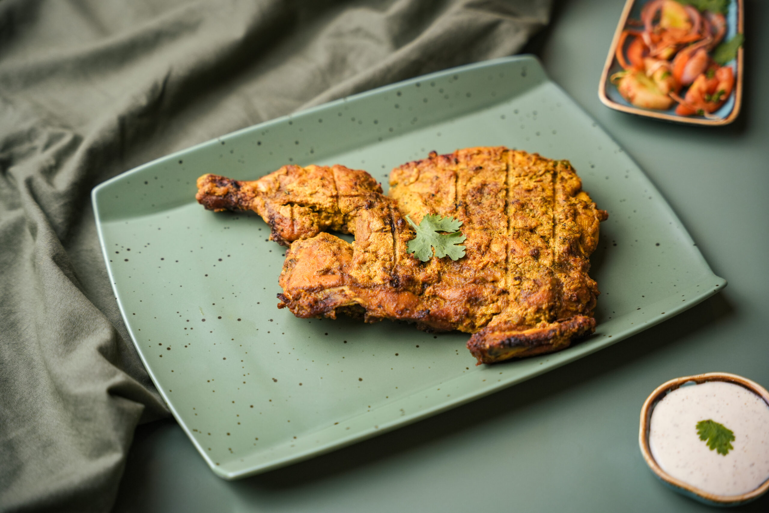 Heavily marinated in a creamy yogurt marinade seasoned with an array of spices and flavoring agents.
