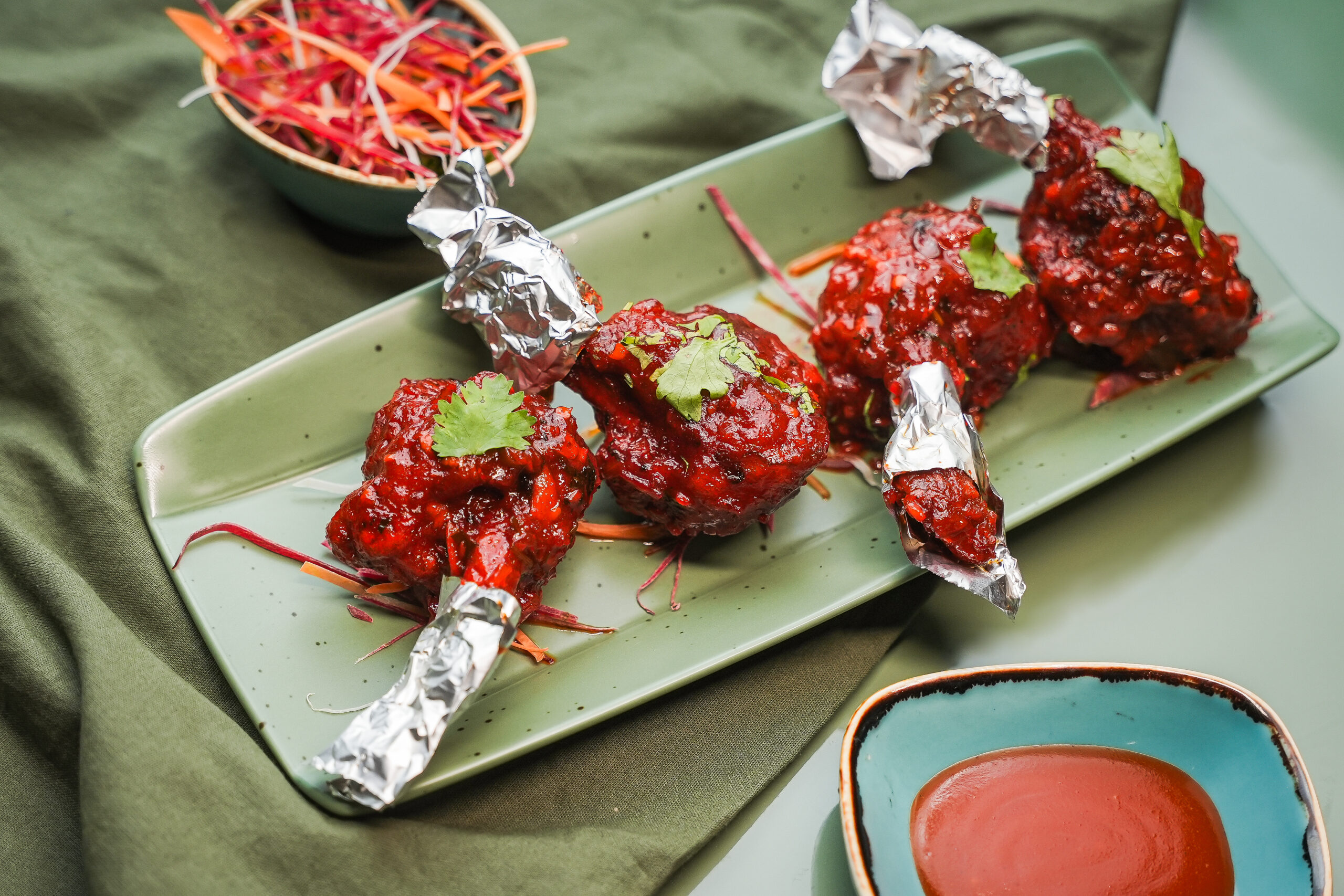 A vegetarian appetizer made by crisp frying cottage cheese and then tossing it in a spicy masala.