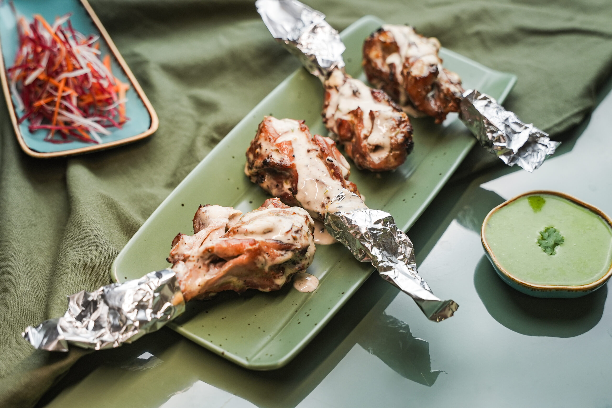 Spiced pieces of boneless chicken baked using skewers on a brazier called an angeethi after marinating in Indian spices and dahi.