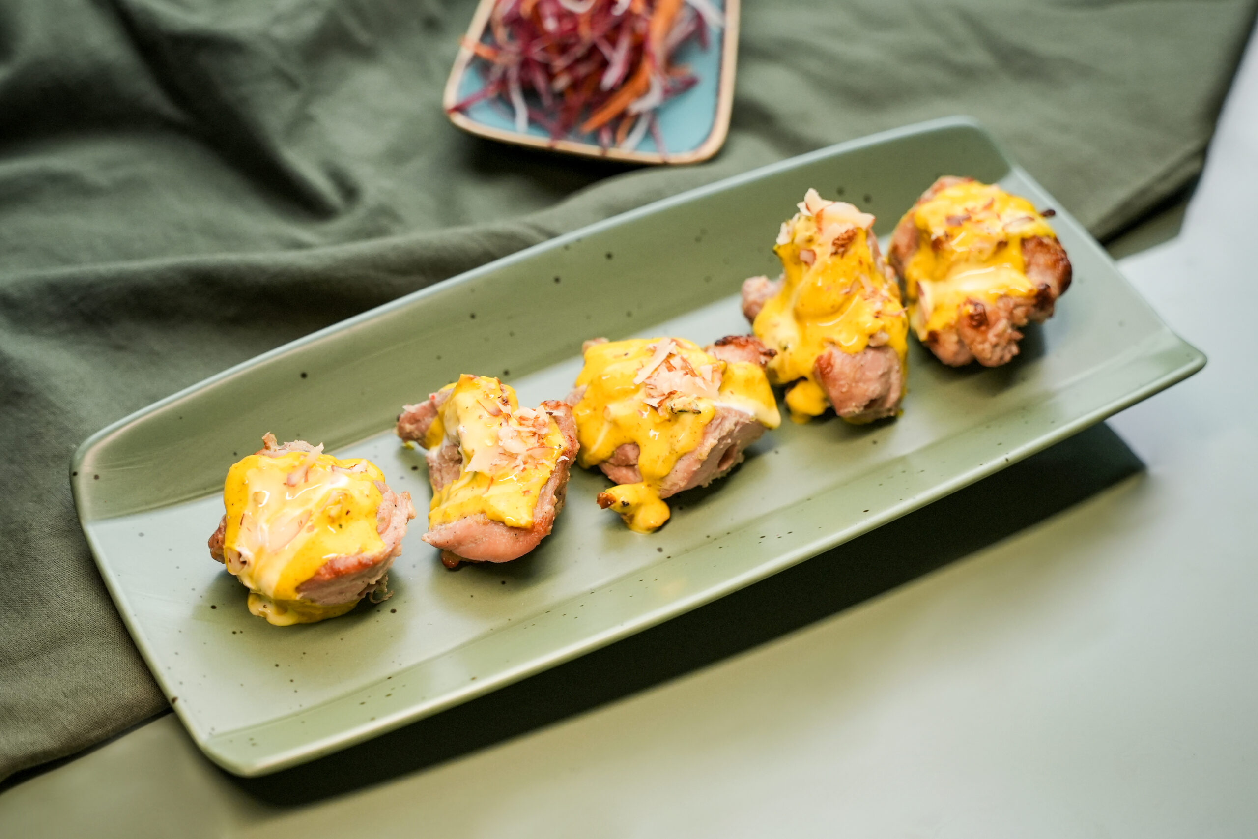 Exotic dish made of fried chicken formed into dumplings, deep-fried, and cooked in a tangy sauce.